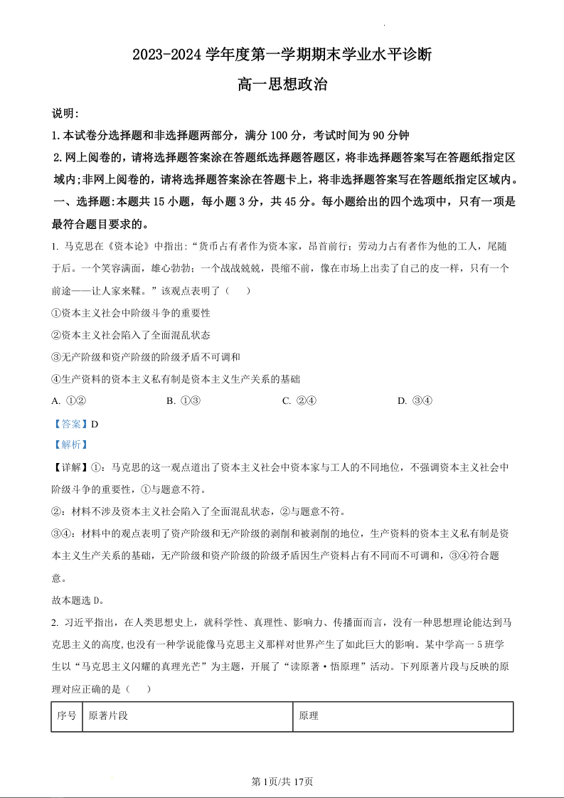 山东省烟台市2023-2024学年高一上学期1月期末测试政治(精品解析版)