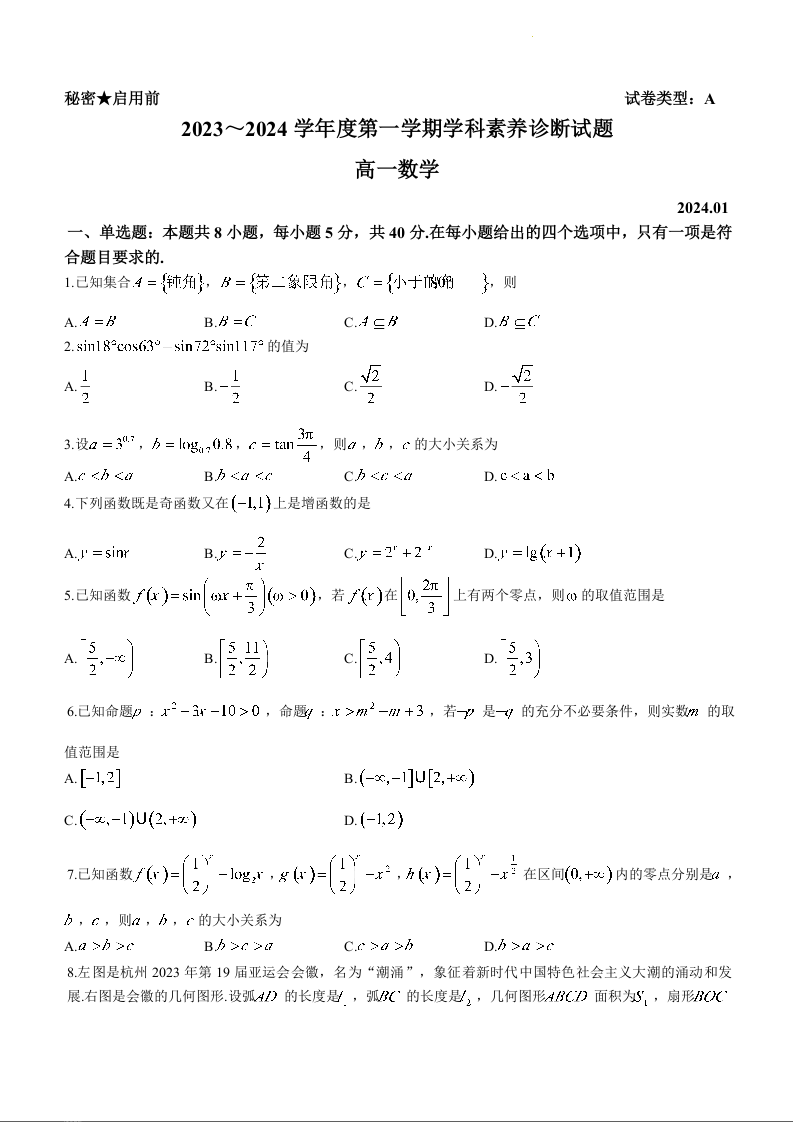 山东省枣庄市薛城区2023-2024学年高一上学期期末考试数学+答案