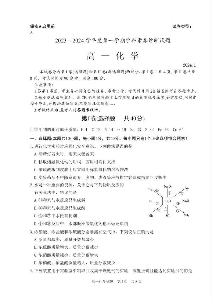 山东省枣庄市薛城区2023-2024学年高一上学期期末考试化学