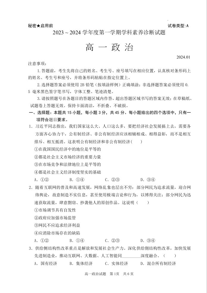 山东省枣庄市薛城区2023-2024学年高一上学期期末考试政治