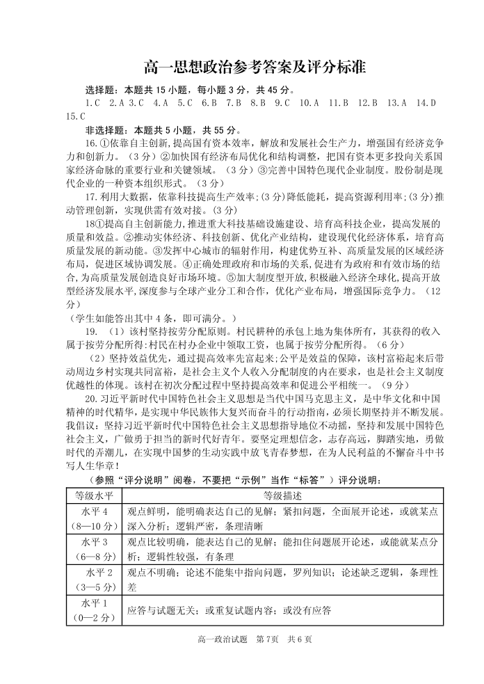 山东省枣庄市薛城区2023-2024学年高一上学期期末考试政治答案