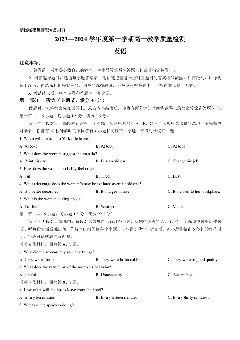 山东省淄博市2023-2024学年高一上学期期末质量监检测英语