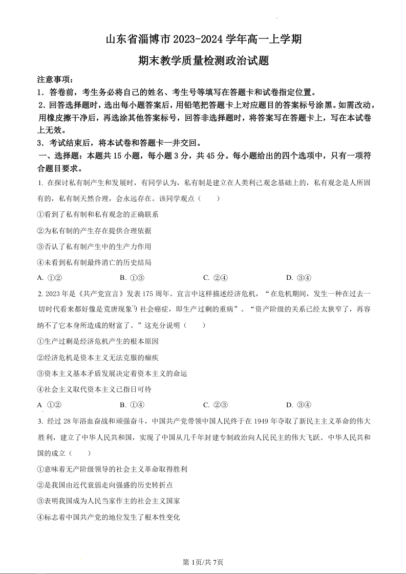 山东省淄博市2023-2024学年高一上学期期末质量监检测政治(原卷版)