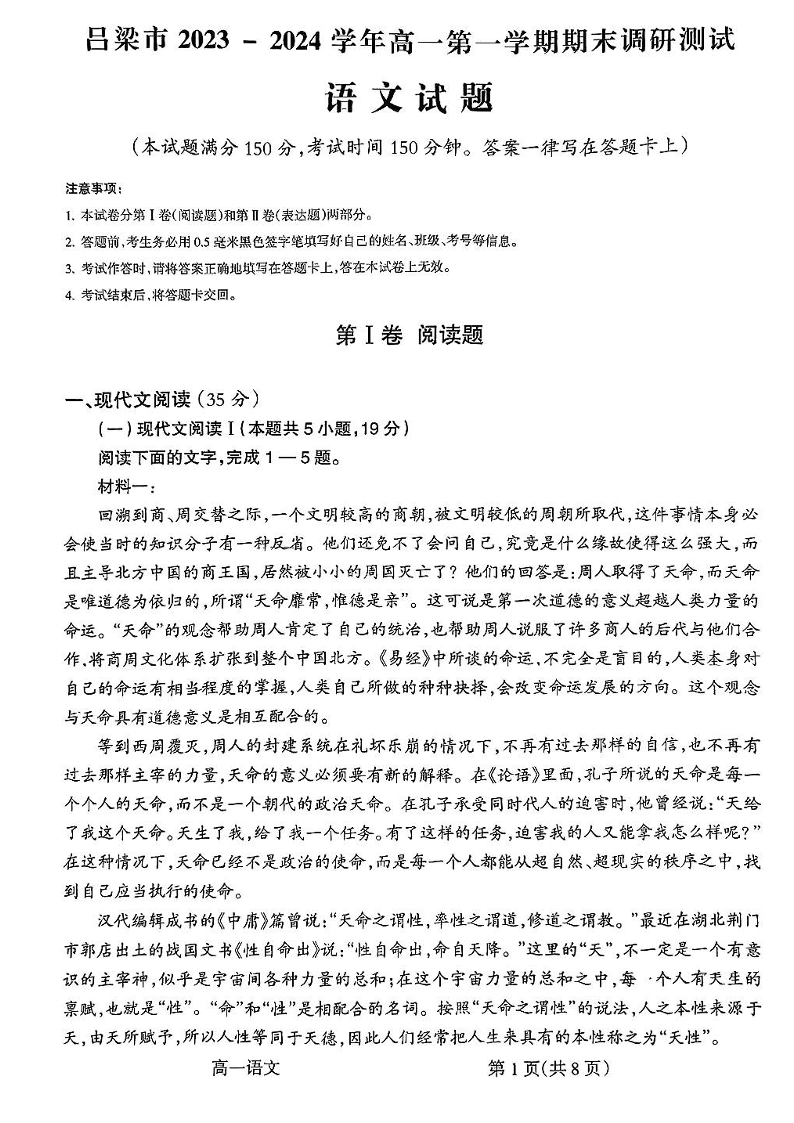 山西省吕梁市2023-2024学年高一上学期期末考试语文