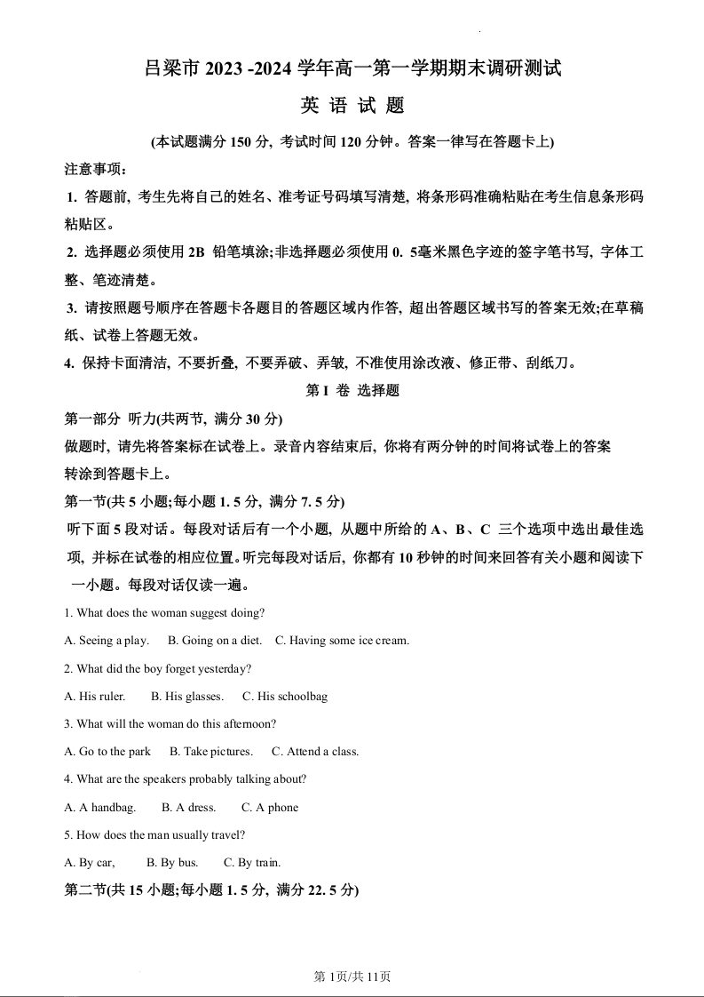 山西省吕梁市2023-2024学年高一上学期期末考试英语(原卷版)