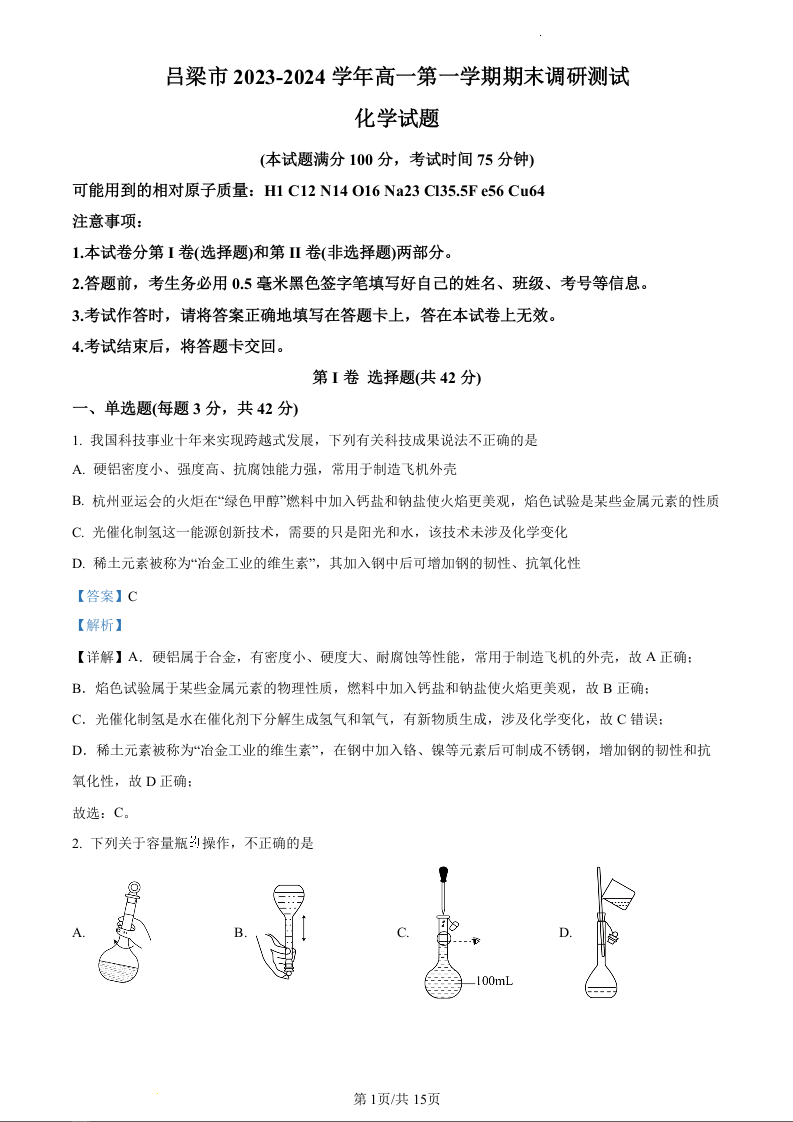 山西省吕梁市2023-2024学年高一上学期期末考试化学(精品解析版)