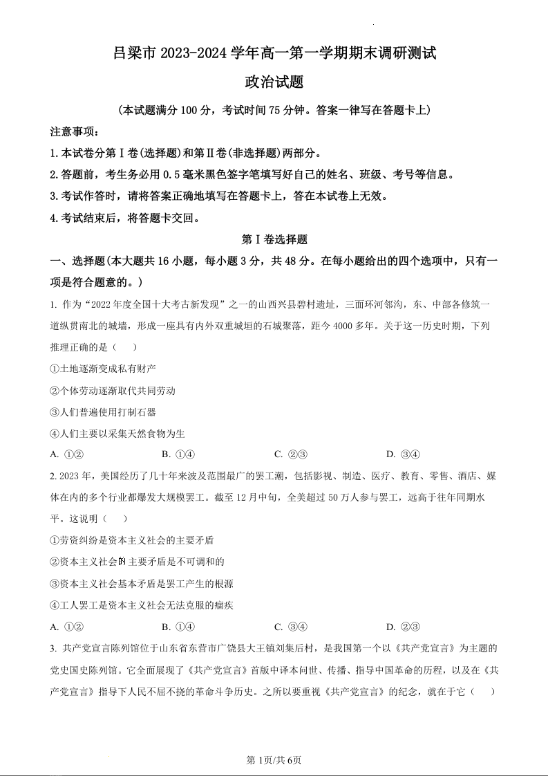 山西省吕梁市2023-2024学年高一上学期期末考试政治(原卷版)