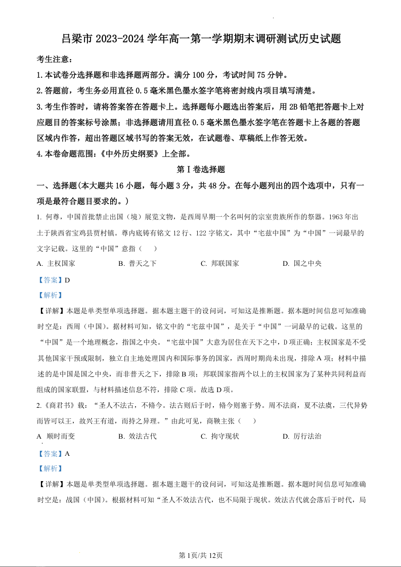 山西省吕梁市2023-2024学年高一上学期期末考试历史(精品解析版)