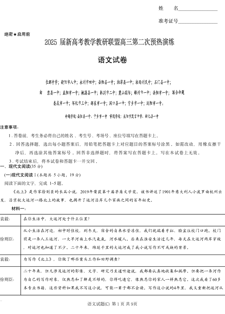 湖南省长沙市长2025年2月郡二十校联盟高三第二次预热演练语文+答案