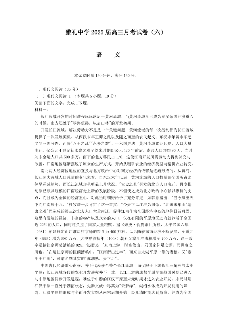 湖南省长沙市雅礼中学2025年2月高三月考试卷(六)语文