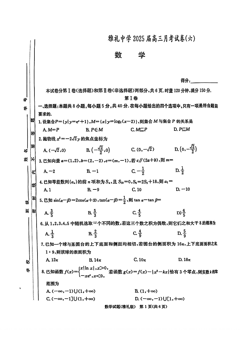 湖南省长沙市雅礼中学2025年2月高三月考试卷(六)数学+答案