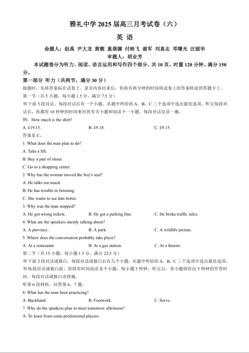 湖南省长沙市雅礼中学2025年2月高三月考试卷(六)英语