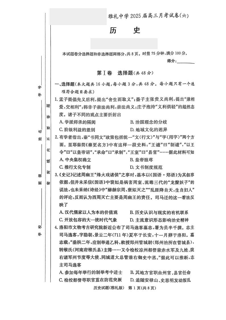 湖南省长沙市雅礼中学2025年2月高三月考试卷(六)历史+答案