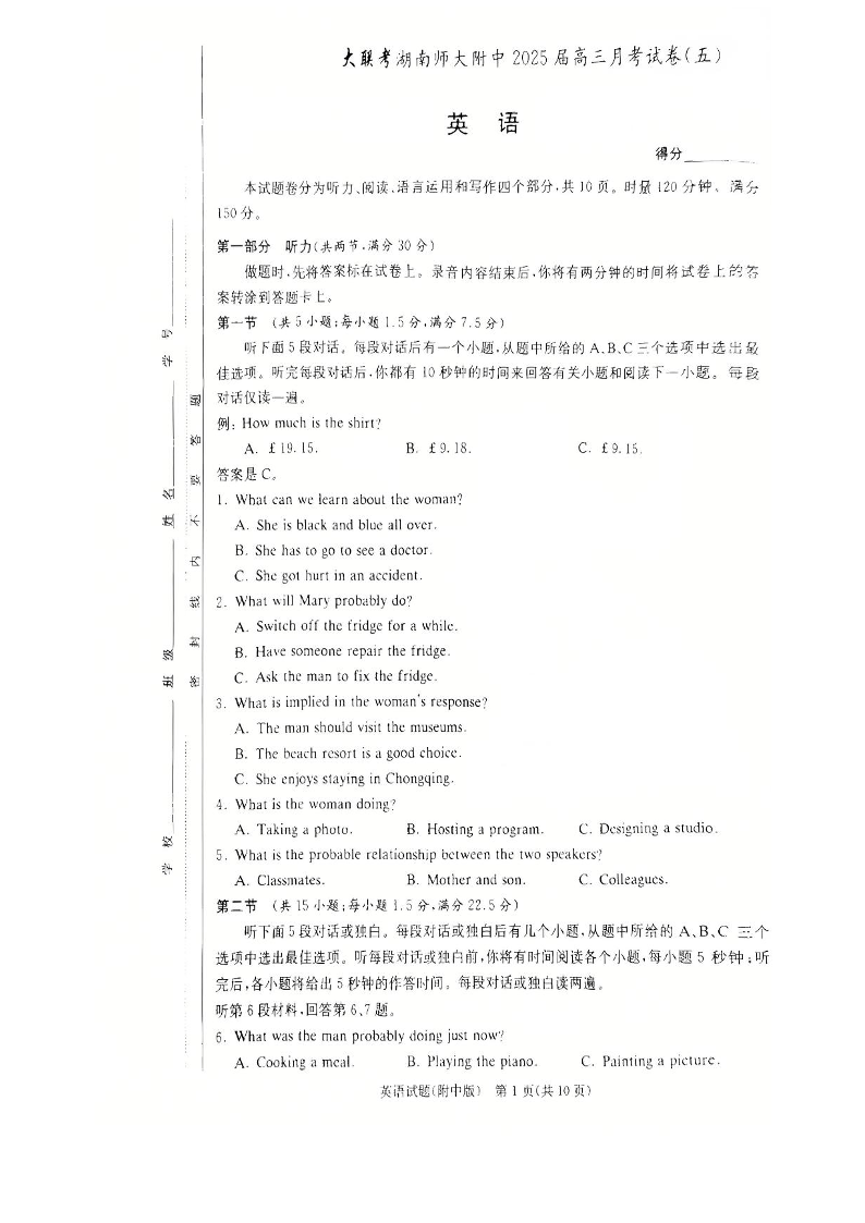 湖南省长沙市湖南师大附中2024-2025学年上学期高三第五次月考英语