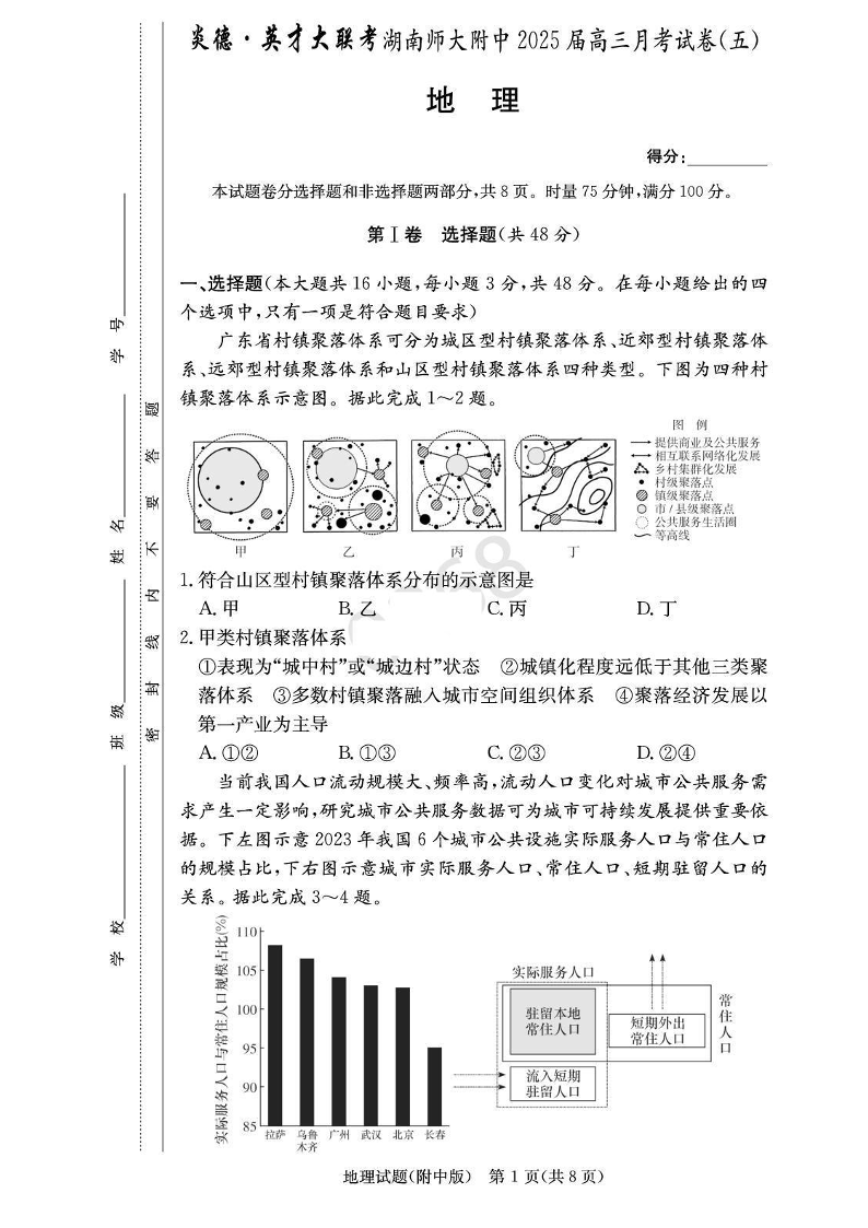 湖南省长沙市湖南师大附中2024-2025学年上学期高三第五次月考地理+答案