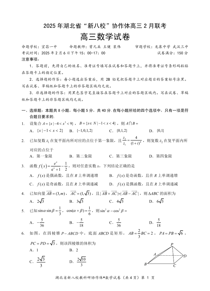 湖北省新八校协作体2025年2月开学高三联考数学+答案