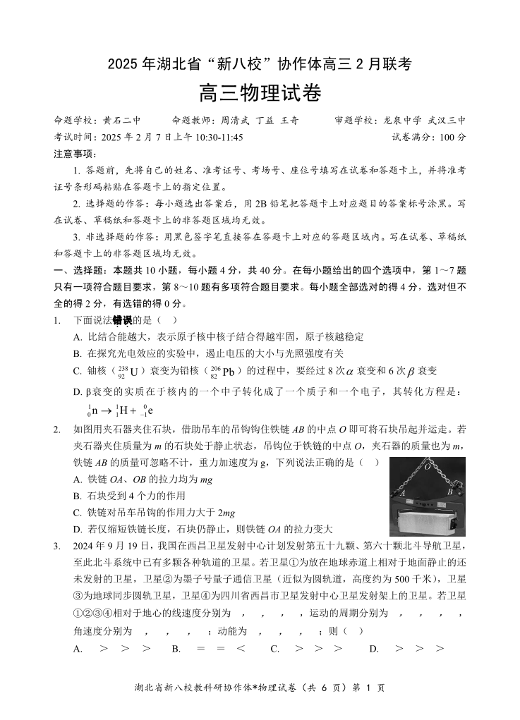 湖北省新八校协作体2025年2月开学高三联考物理+答案