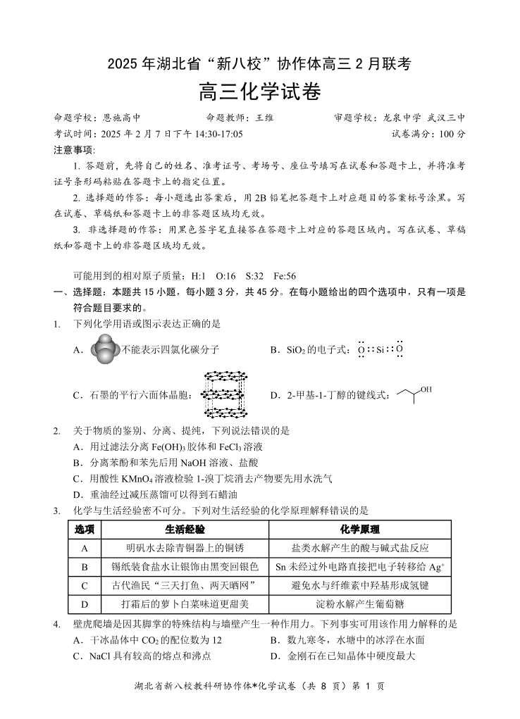 湖北省新八校协作体2025年2月开学高三联考化学+答案