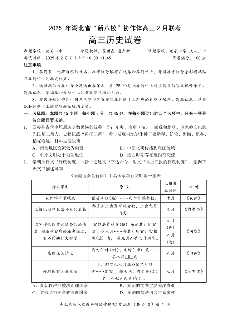 湖北省新八校协作体2025年2月开学高三联考历史+答案