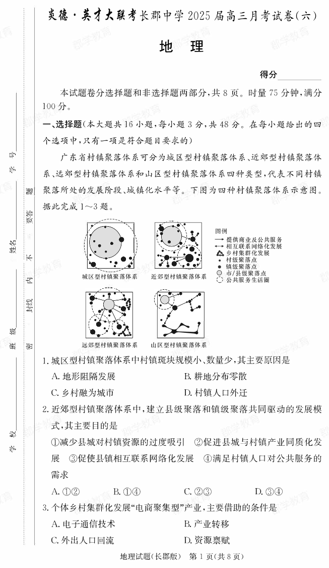 湖南省长沙市长郡中学2025年2月高三月考(六)地理+答案