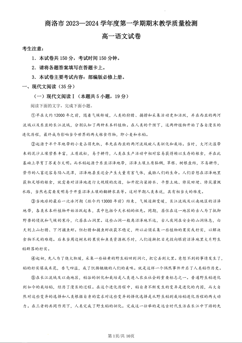 陕西省商洛市2023-2024学年高一上学期期末统测语文(原卷版)