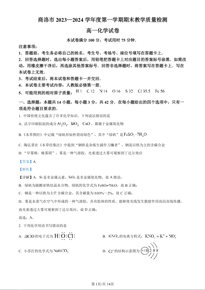 陕西省商洛市2023-2024学年高一上学期期末统测化学(精品解析版)