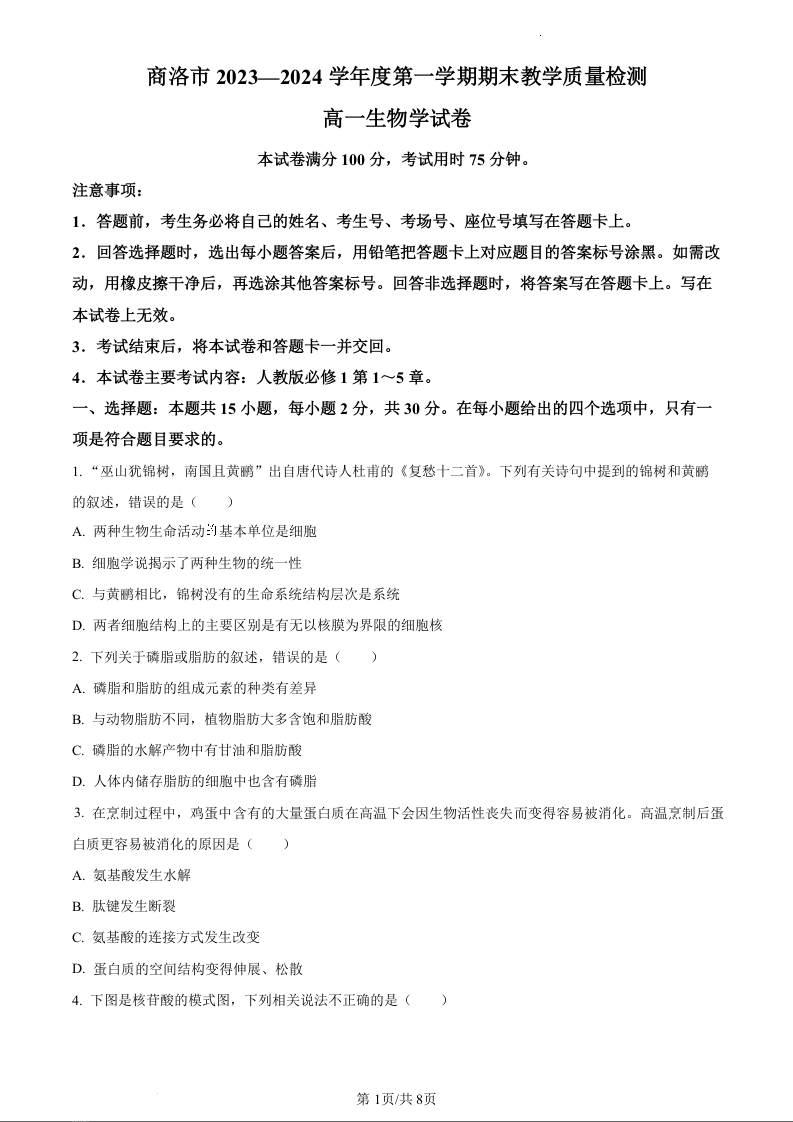 陕西省商洛市2023-2024学年高一上学期期末统测生物(原卷版)