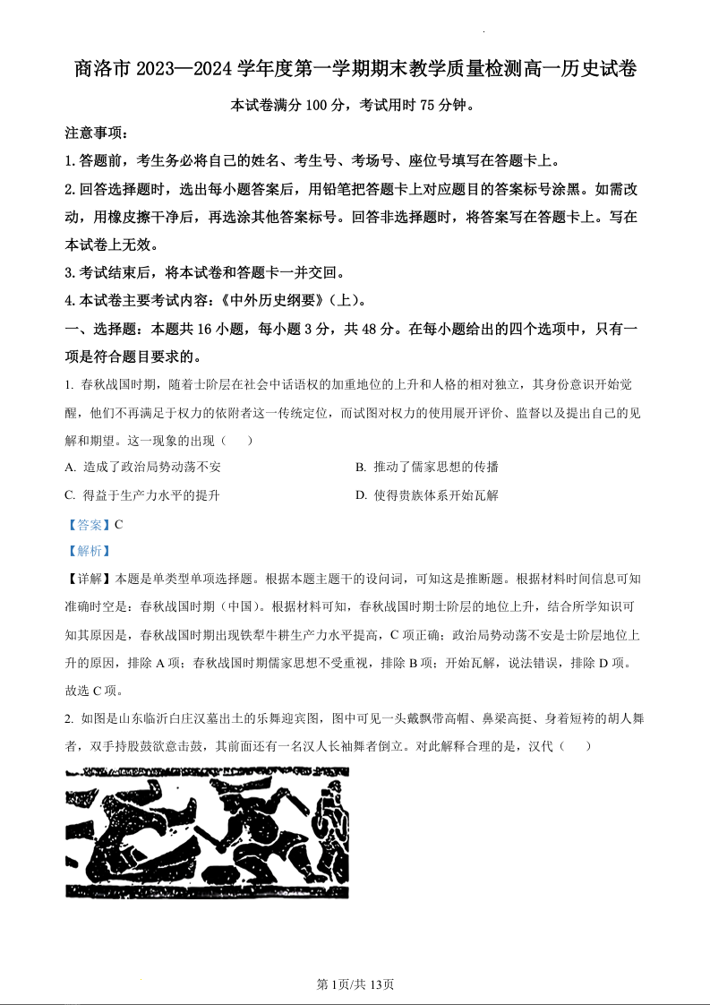 陕西省商洛市2023-2024学年高一上学期期末统测历史(精品解析版)