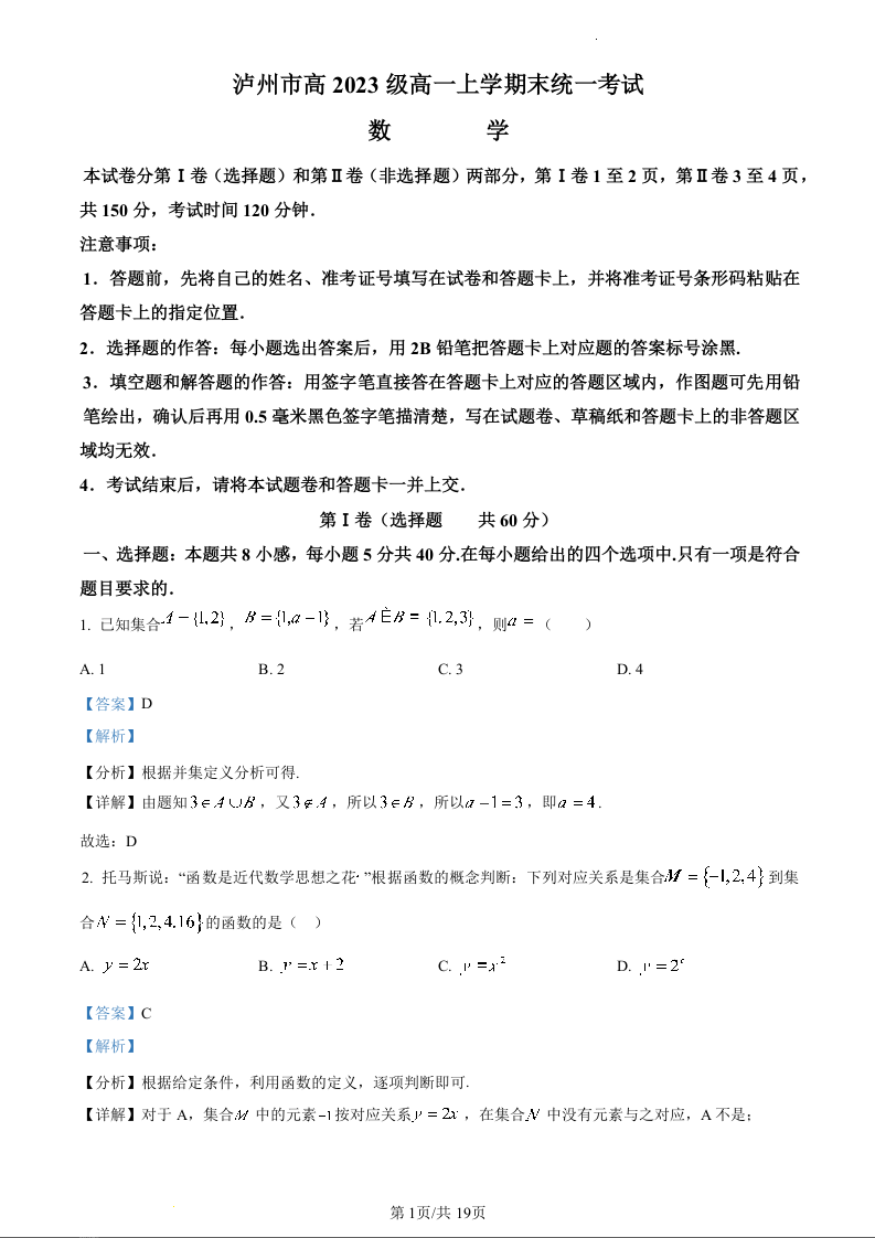 四川省泸州市2023-2024学年高一上学期期末考试数学(精品解析版)