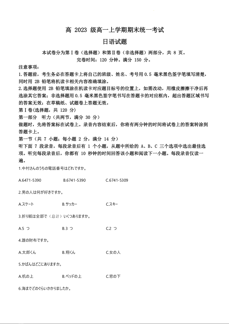 四川省泸州市2023-2024学年高一上学期期末考试日语+答案