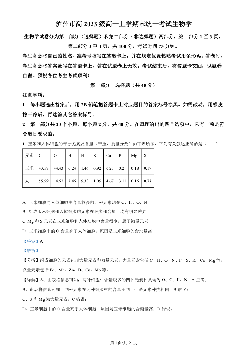 四川省泸州市2023-2024学年高一上学期期末考试生物(精品解析版)