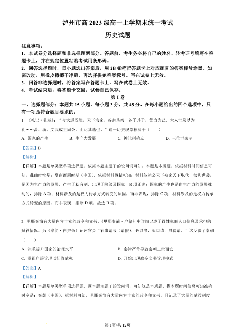 四川省泸州市2023-2024学年高一上学期期末考试历史(精品解析版)