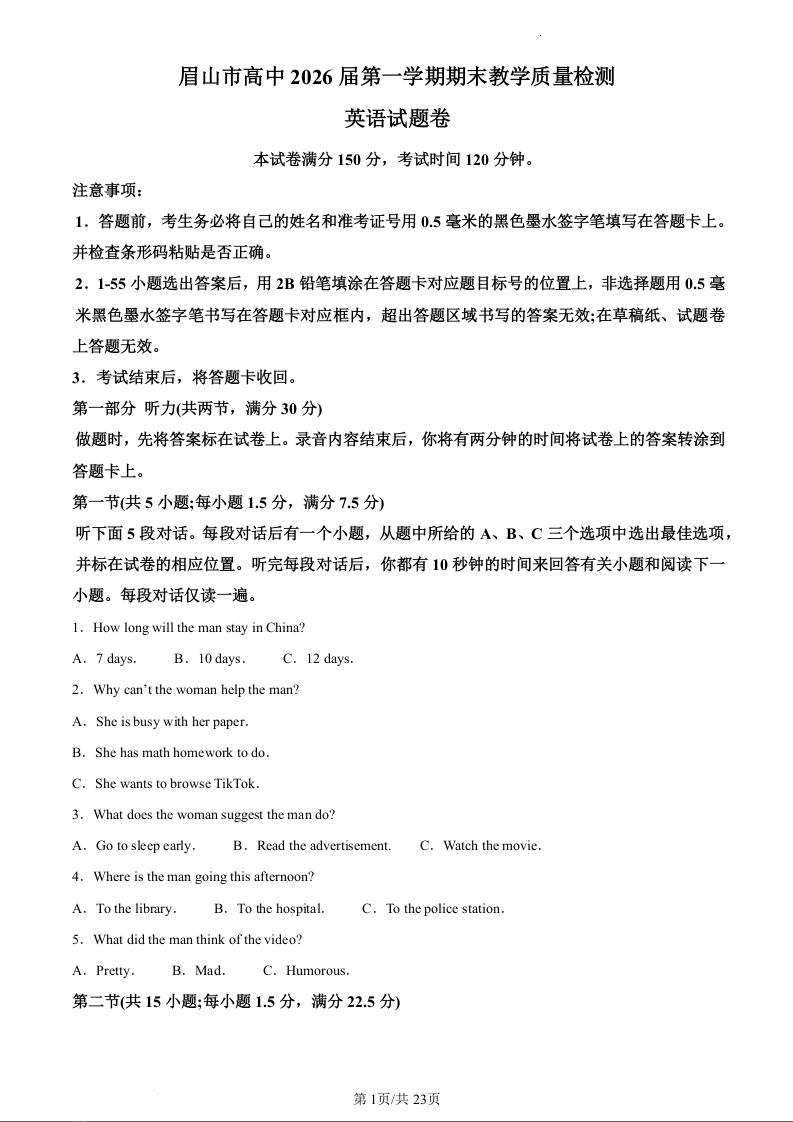 四川省眉山市2023-2024学年高一上学期期末考试英语(精品解析版)