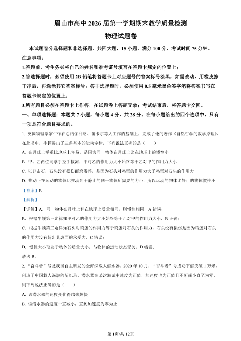 四川省眉山市2023-2024学年高一上学期期末考试物理(精品解析版)