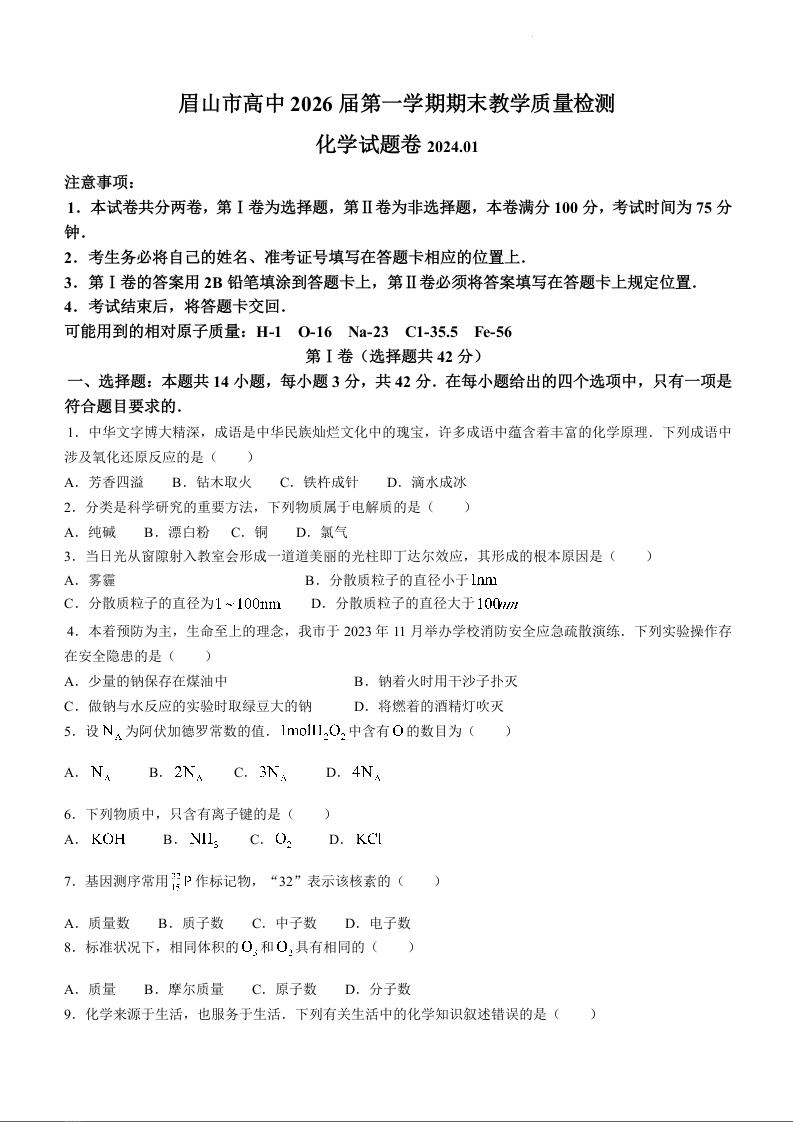 四川省眉山市2023-2024学年高一上学期期末考试化学+答案