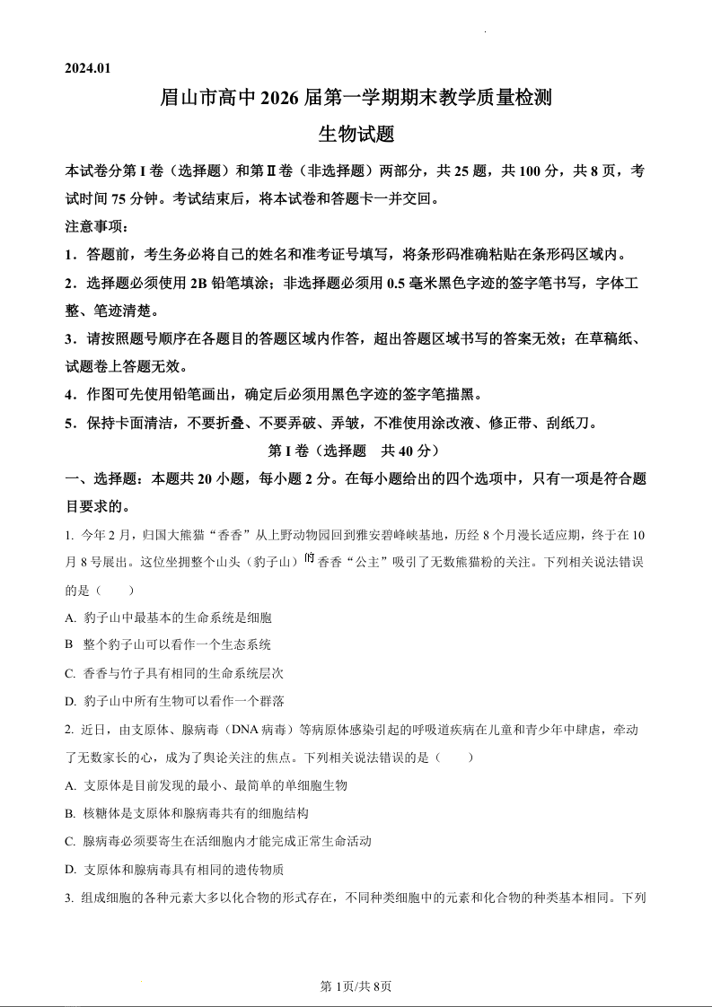 四川省眉山市2023-2024学年高一上学期期末考试生物(原卷版)