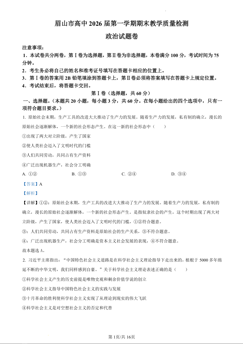 四川省眉山市2023-2024学年高一上学期期末考试政治(精品解析版)