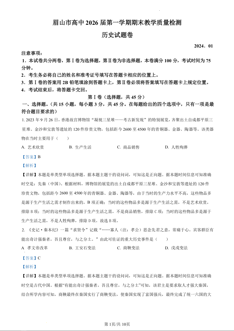 四川省眉山市2023-2024学年高一上学期期末考试历史(精品解析版)