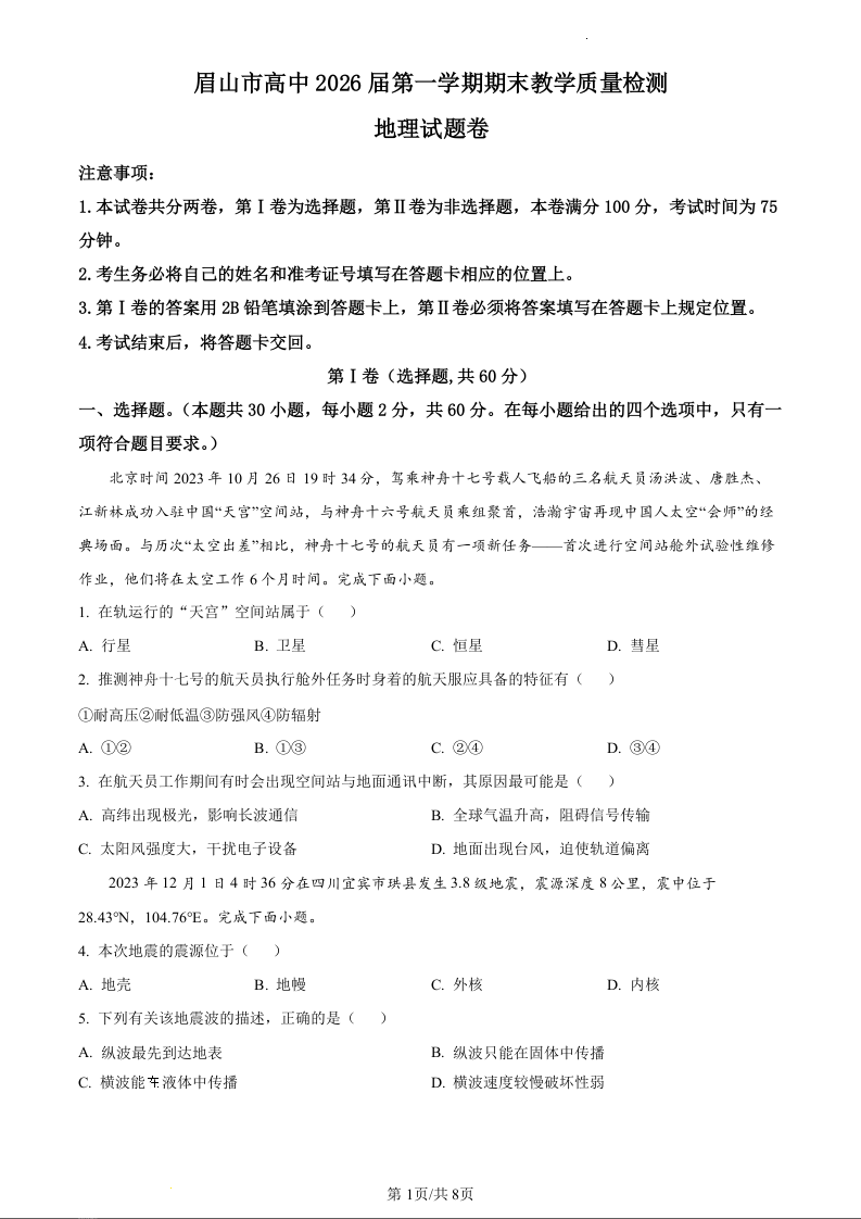 四川省眉山市2023-2024学年高一上学期期末考试地理(原卷版)