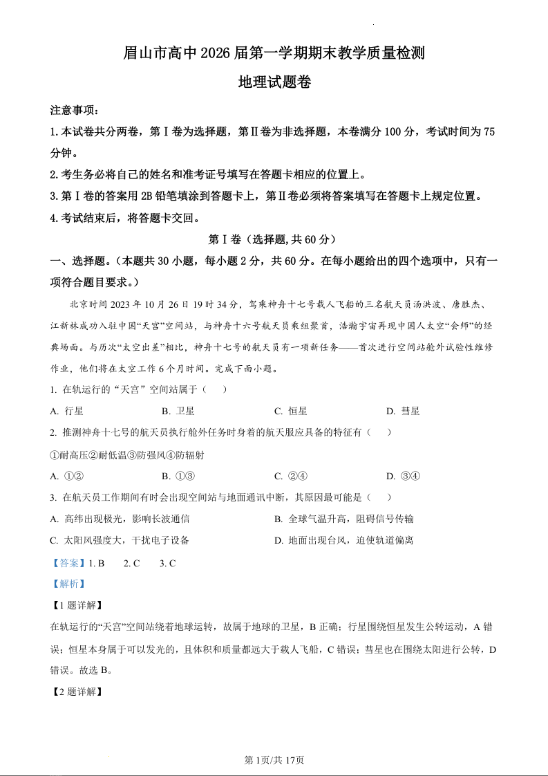 四川省眉山市2023-2024学年高一上学期期末考试地理(精品解析版)