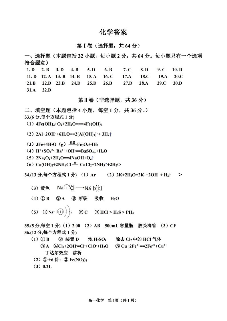 天津市红桥区2023-2024学年高一上学期期末考试化学答案