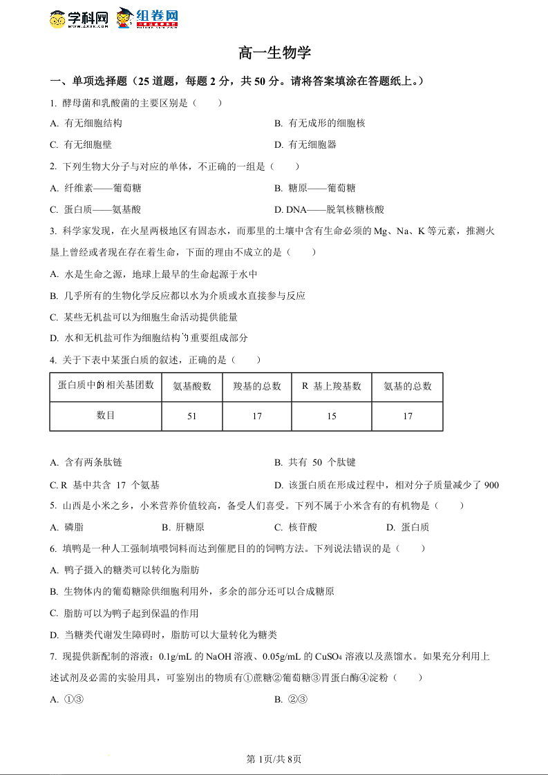 天津市红桥区2023-2024学年高一上学期期末考试生物(原卷版)