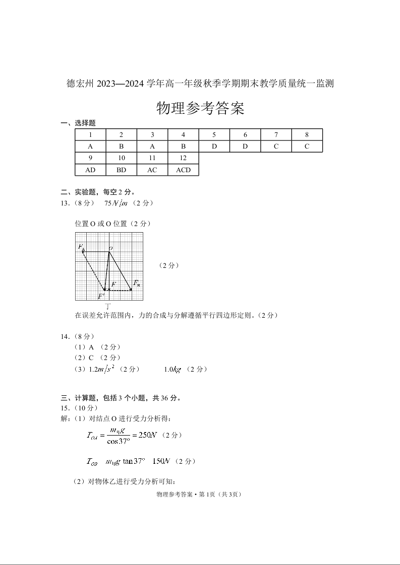 云南省德宏州2023-2024学年高一上学期期末考试物理答案