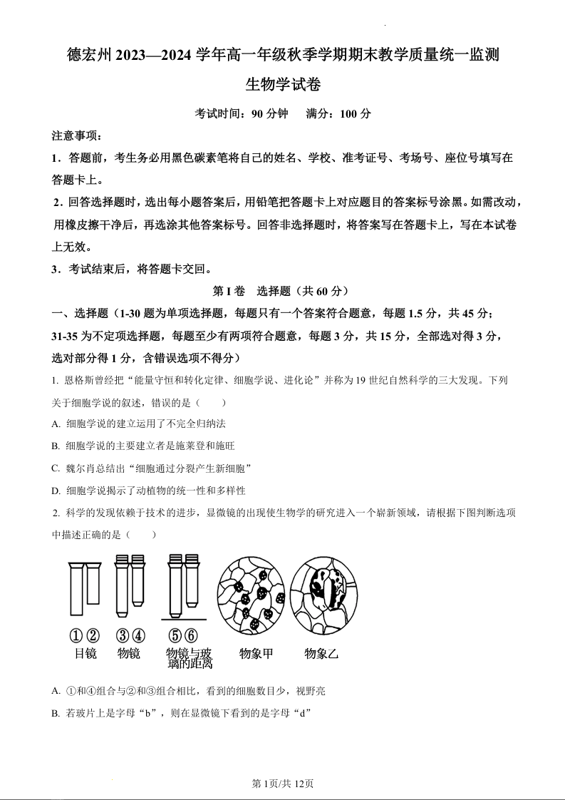 云南省德宏州2023-2024学年高一上学期期末考试生物(原卷版)