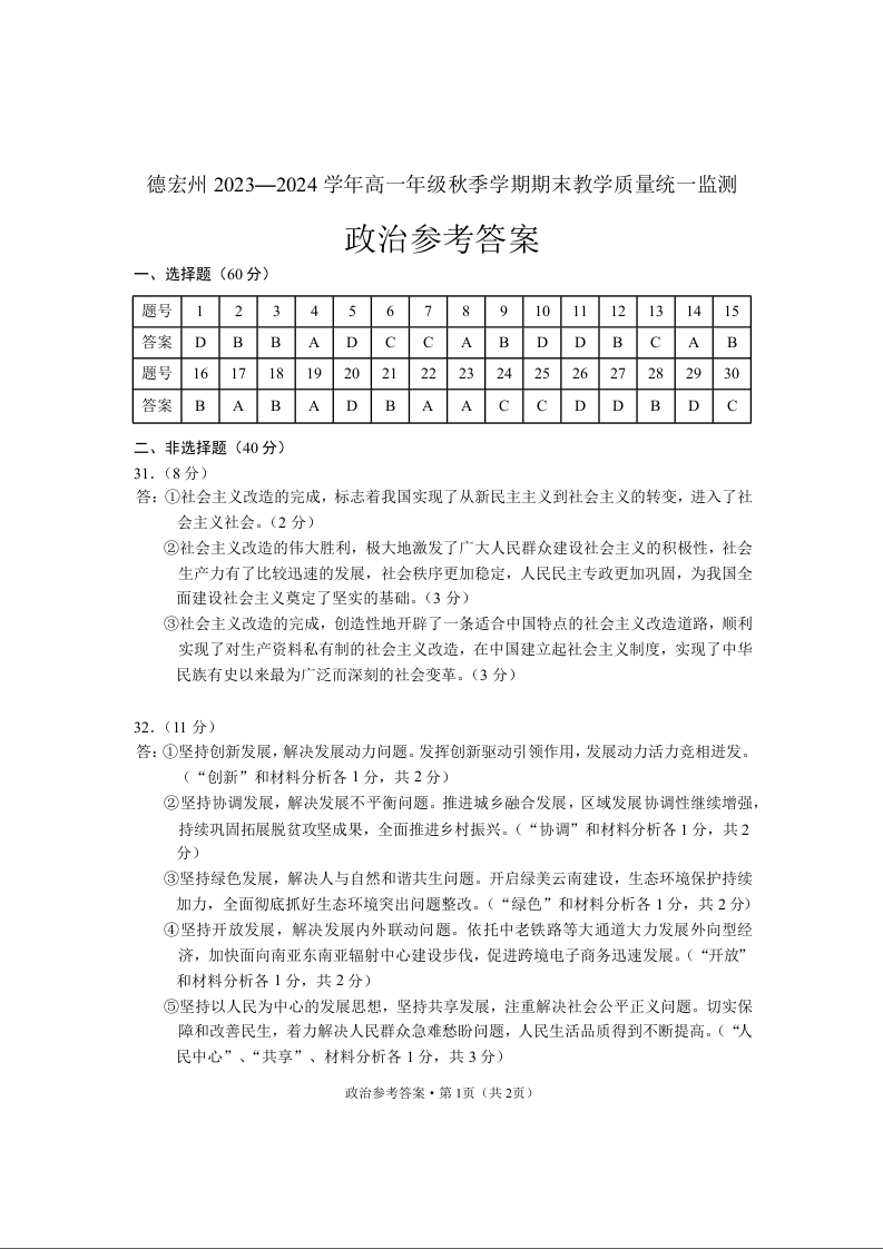 云南省德宏州2023-2024学年高一上学期期末考试政治答案