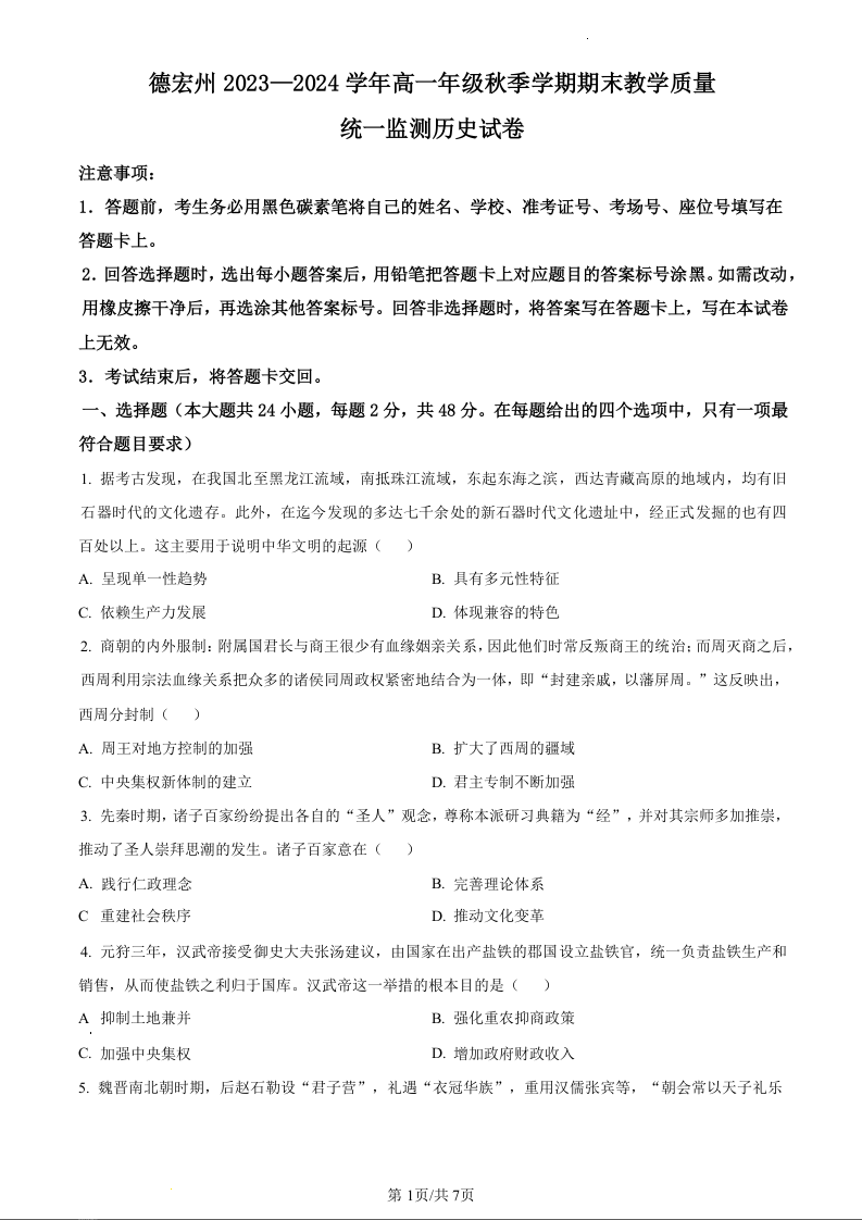 云南省德宏州2023-2024学年高一上学期期末考试历史(原卷版)