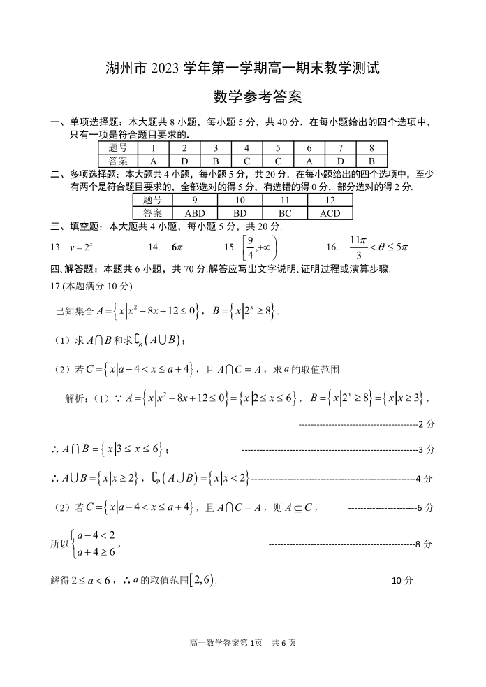浙江省湖州市2023-2024学年高一上学期期末考试数学答案
