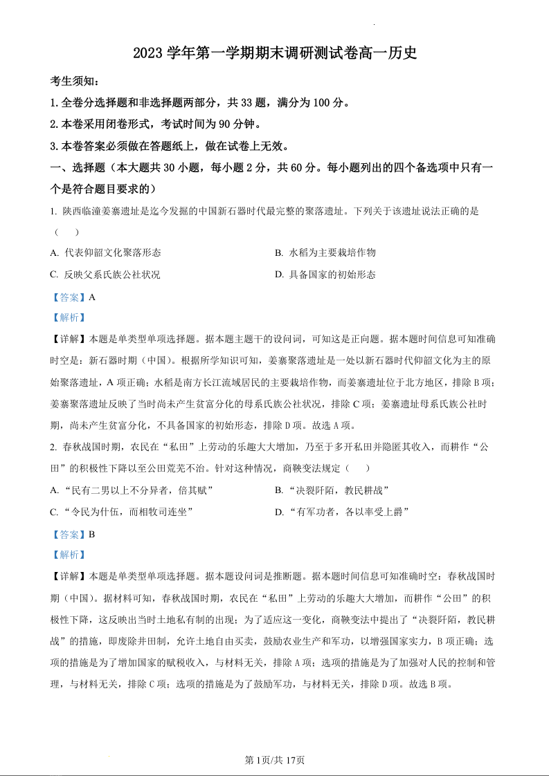 浙江省湖州市2023-2024学年高一上学期期末考试历史(精品解析版)