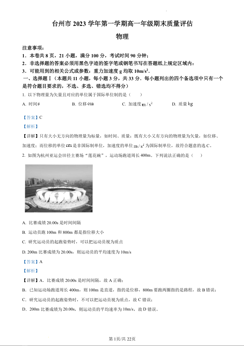 浙江省台州市2023-2024学年高一上学期1月期末考试物理(精品解析版)