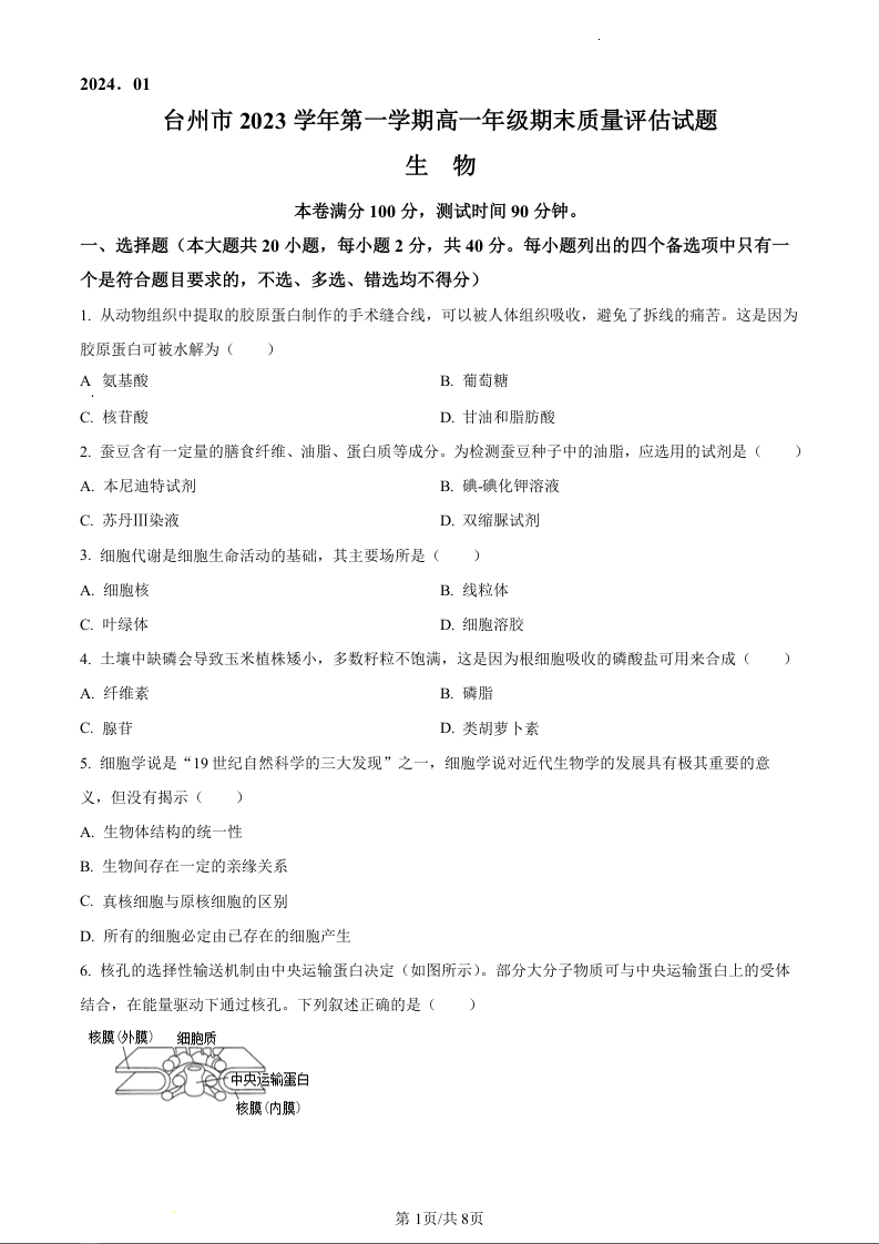 浙江省台州市2023-2024学年高一上学期1月期末考试生物(原卷版)